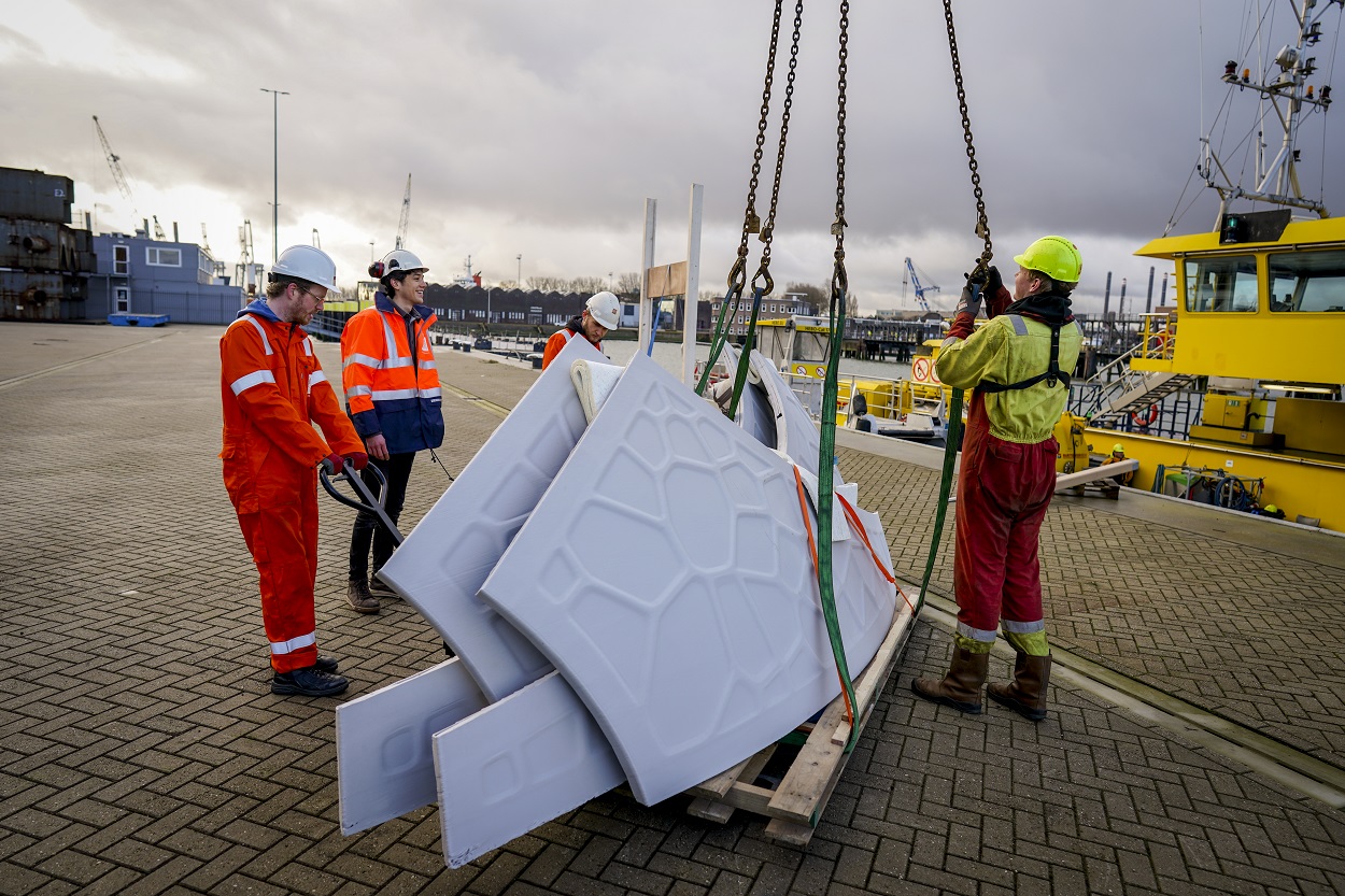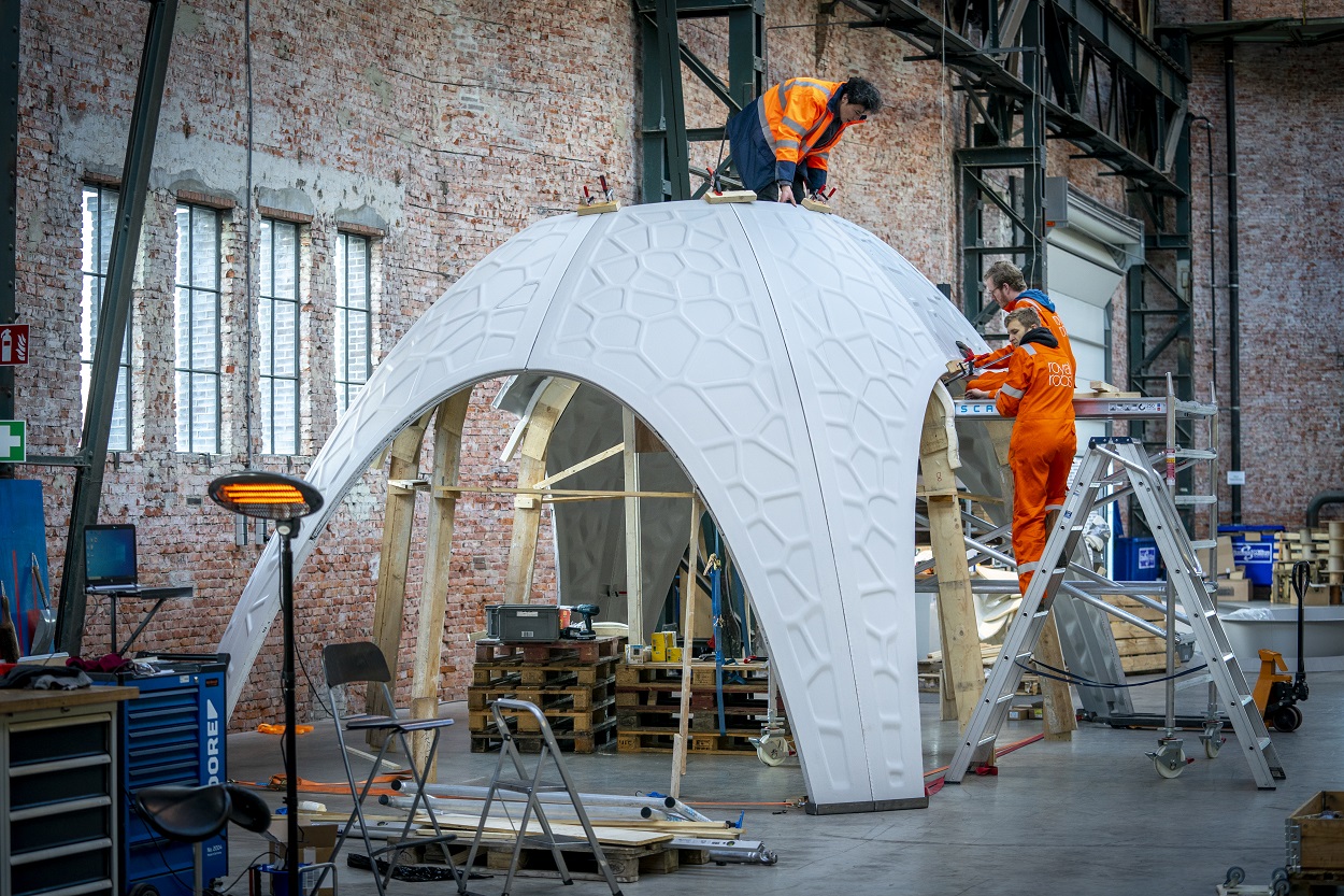 Het materiaal dat de basis vormt voor de R-IGLO is kunststof PET-afval uit de (haven-)industrie. Dit is steeds weer volledig herbruikbaar, ook als bijvoorbeeld een print mislukt. Het geavanceerde en 100% circulaire ontwerp zorgt ervoor dat het materiaal niet alleen bijzonder efficiënt toegepast wordt, maar levert voor de gebruikers ook een prettige akoestiek en voldoende inval van daglicht op.